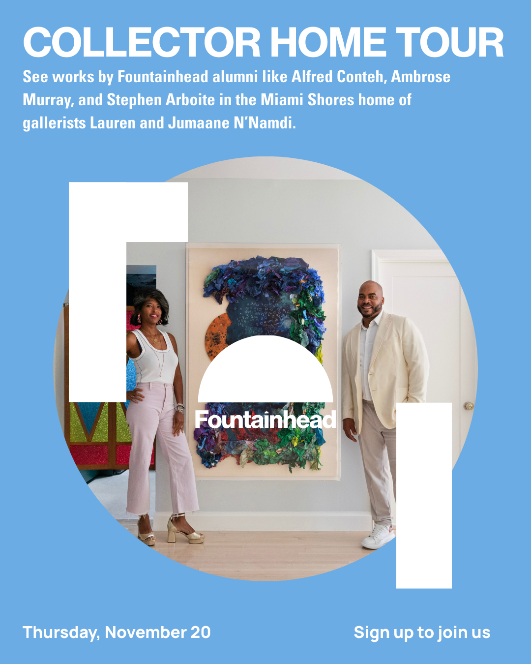 Fountainhead Experience members are invited to tour the home and collection of Jumaane and Lauren N’Namdi, the directors of the Miami- and Detroit-based gallery N’Namdi Contemporary.